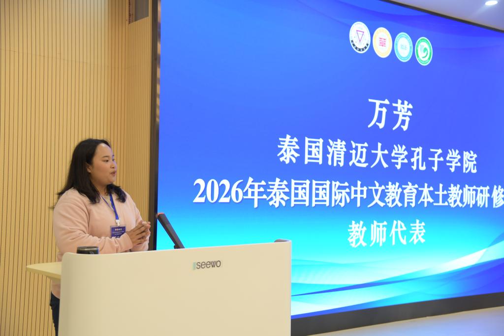 泰国清迈大学孔子学院万芳老师代表学员发言。她感谢云南省教育厅、云南师范大学给予学习机会。她表示学员们将认真向中国老师学习前沿教学理论、实操与应用,将所学所感带回泰国课堂,为推动泰国中文教育的发展、深化中泰友谊贡献自己的力量。