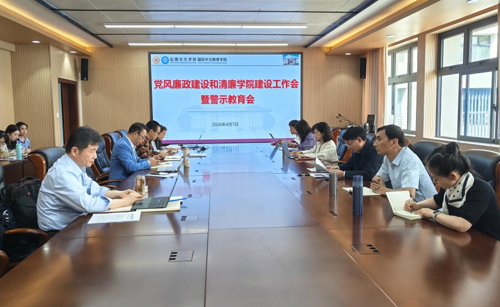4月7日上午,云南华文学院(国际中文教育学院)在华文楼509会议室召开2026年党风廉政建设和清廉学院建设工作会暨警示教育会。全体院领导、科室负责人、党支部书记、系主任、专业负责人参加会议。