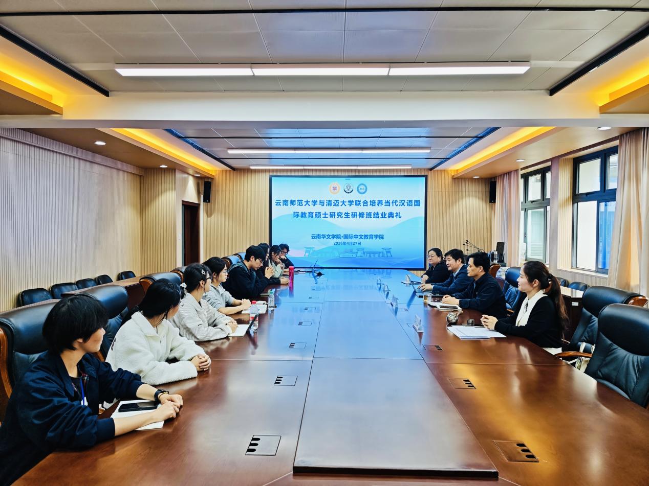 4月27日下午,云南师范大学与清迈大学联合培养当代汉语国际教育硕士研究生研修班结业典礼在云南华文学院509会议室举行。来自泰国清迈大学的10名研究生圆满完成在华为期一个月的研修任务,顺利结业。云南华文学院副院长黄启庆教授、指导教师夏玉清教授、李雅梅副教授及姚月燕副教授出席了典礼。