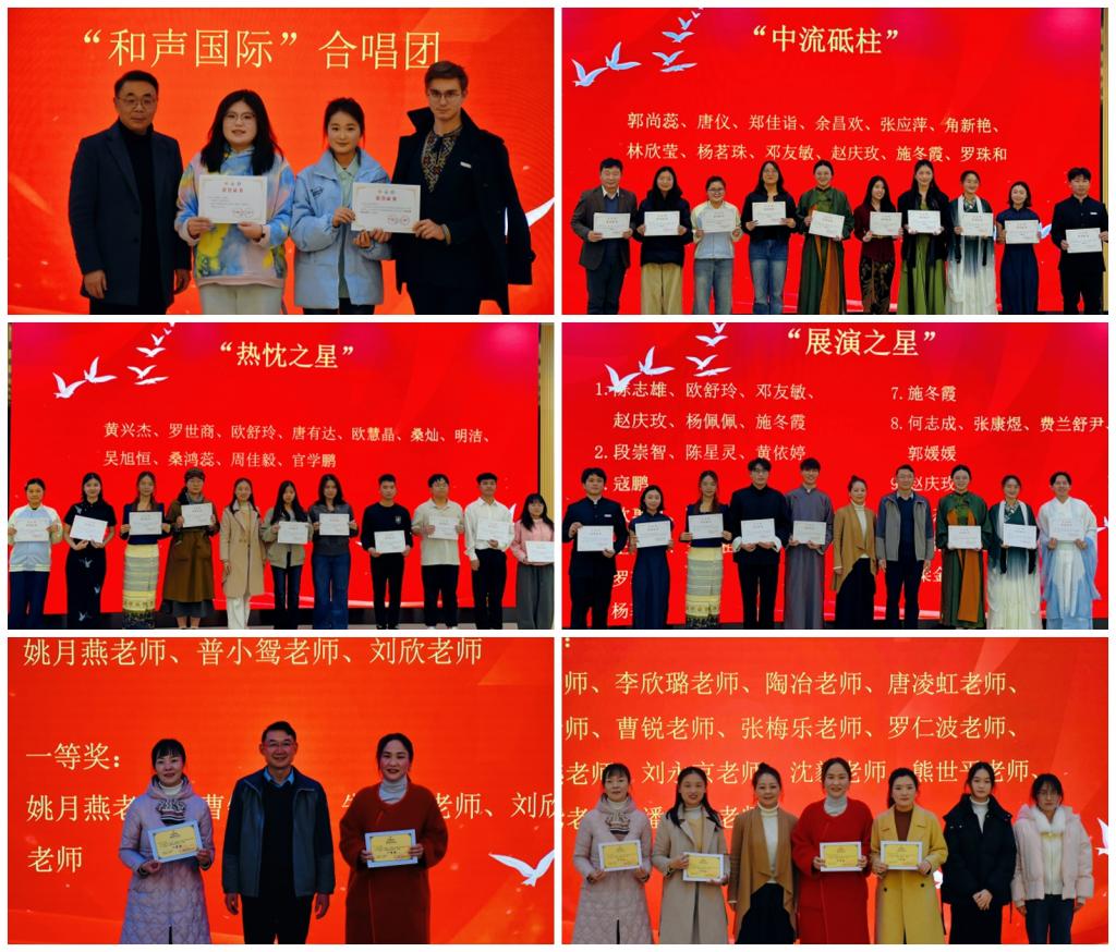 展演与分享环节结束后,学院领导为“十一月的诗迹”诗歌朗诵大赛获奖者颁发了奖状。同时,为“和声国际”合唱团颁发了“星辉共耀特别贡献奖”,为水之湄文学社骨干成员与积极社员分别授予“中流砥柱奖”与“热忱之星奖”,并为展演同学颁发“展演之星奖”,每一份荣誉,都是对同学们热爱与付出的高度认可。