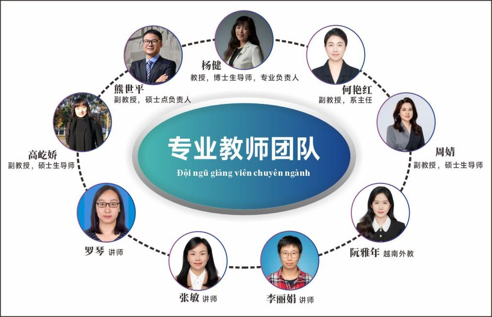 专业拥有一支学历层次高、国际化背景强、教研成果丰硕的师资队伍。现有中外籍教师9人,其中教授1人(博士生导师、省级教学名师)、副教授4人(硕士生导师)、讲师3人。100%的中国籍教师拥有硕士以上学位及长期赴越留学或访学经历。常年聘任越南籍专家承担核心语言课程,营造纯正的学习环境。教师团队多次承担高级别外事翻译任务,并将丰富的实务经验融入教学,多人荣获省校级“优秀教师”称号,并主持多项国家级、省部级教研课题。